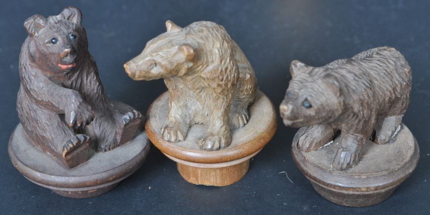 A collection of 19th Century German hand carved Black Forest bear items to include two carved pipes, bottle toppers / topsor caps and corks. Each item featuring a carved bear figurine / figure. Largest measures approx; 12cm tall.