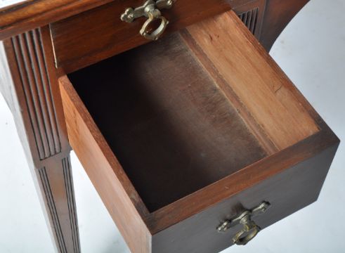 An Edwardian mahogany writing table desk having an inset gilt tooled leather writing sciver with flared table top over a central arched knee hole recess flanked by two long drawers over two smaller drawers. Carved reeded detailing throughout and raised on tapering legs with brass castors. The drawer fronts set with architectural brass handles. Measures approx; 77cm x 113cm x 61cm.