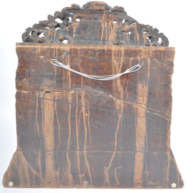 A large 17th Century Belgium chestnut and walnut carved ecclesiastical confessional seat cresting rail depicting a religious heavenly ascent scene. Scroll and foliate decoration throughout with carved figures, birds and masks with a central chrube below a protruding Jesus holding the orb with detailed carved leaf decoration surrounding him. Wear commensurate with age, overall a good example. Measures approx; 94cm x 71cm x 17cm.