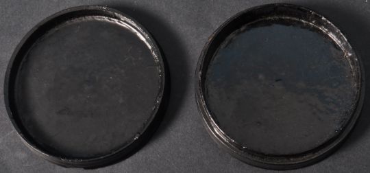 A 19th Century Victorian 1840 paper mache snuff box / pot of circular form having a hand painted portrait depicting Queen Victoria to the lid and being ebonised throughout. Wear commensurate with age with small chip the lid. Measures approx; 2cm x 7.5cm diameter.