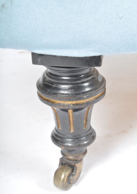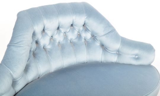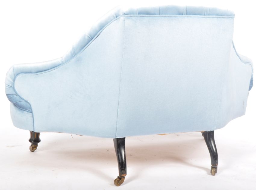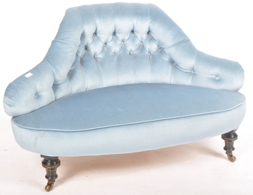A Victorian 19th Century mahogany ‘love ‘sofa settee having turned legs with overstuffed blue velour seat and button backing. Measures approx; 82cm x 133cm x 58cm