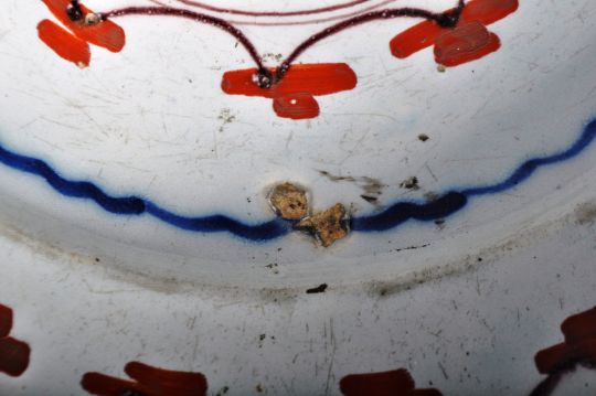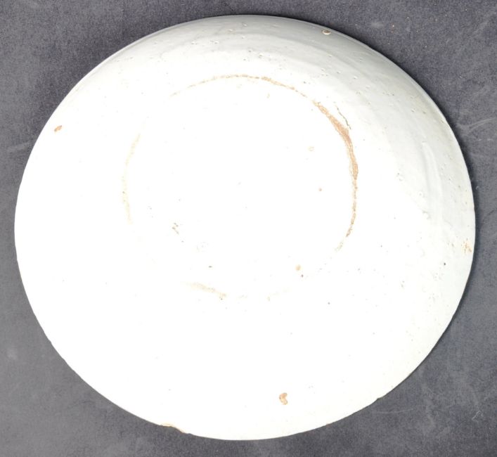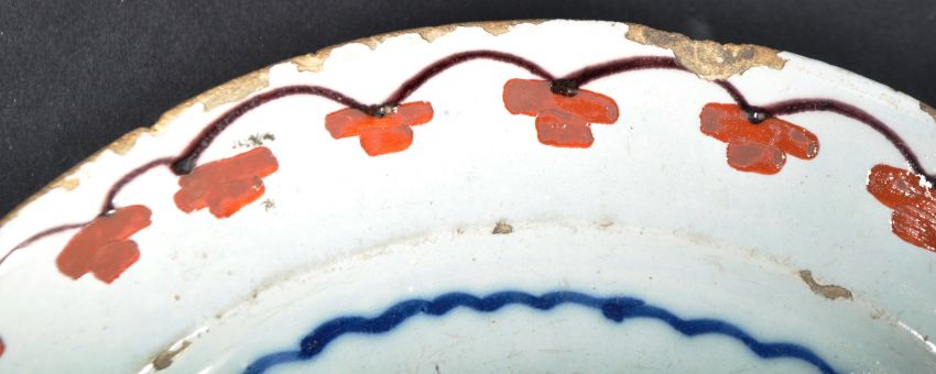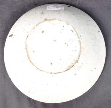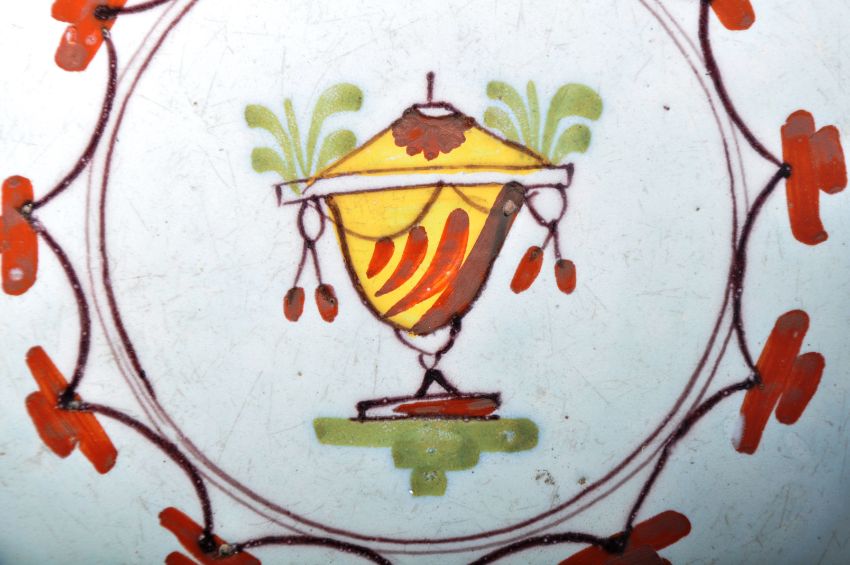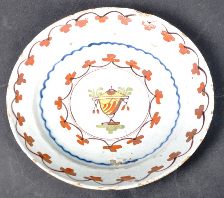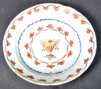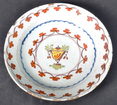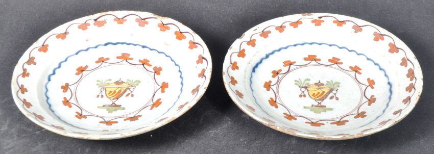 A pair of 18th Century Delft pottery tin glazed earthenware charger plates of circular form having central hand painted decoration of urns with two rings of red painted scrolled detailing interspersed by a single blue band. Each measures approx; 22cm diameter.