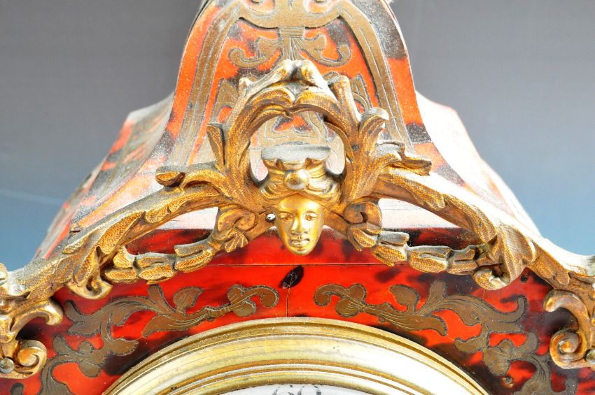 A 19th Century French Boulle Work mantel clock by Samuel Marti. The clock of shaped form with red tortoiseshell and scrolling brasswork. Gilded ormolu finial top top with applied scrolled mounts. The dial being white enamel with gilt pierced hands. Strikes on a bell and compete with pendulum. Measures approx; 37cm tall.