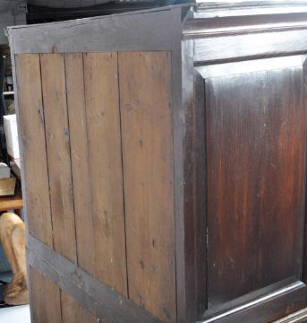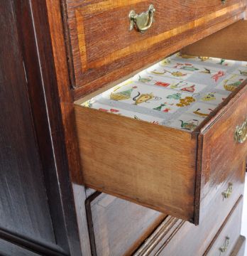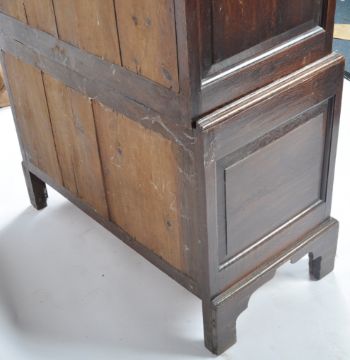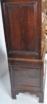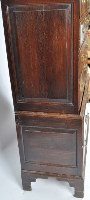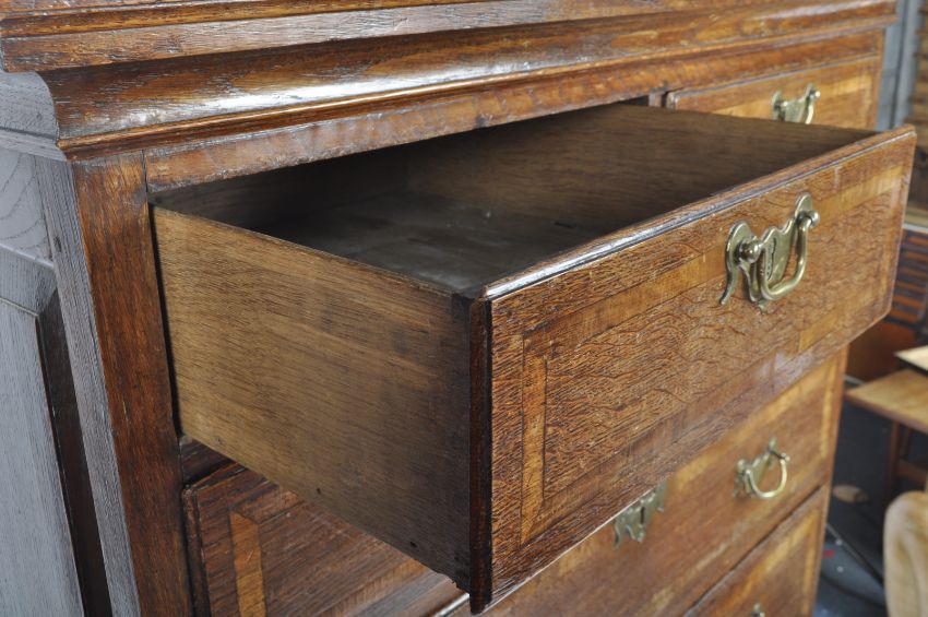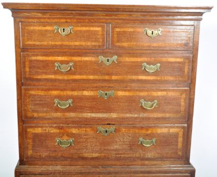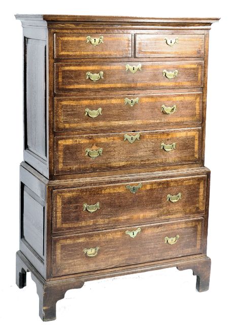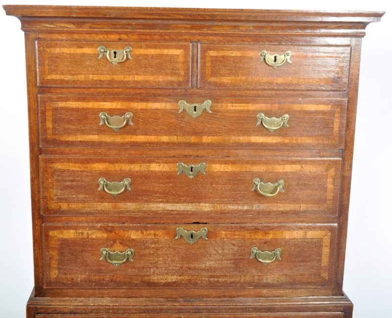 An 18th Century crossbanded oak Queen Anne chest on chest of drawers of small proportions, raised on bracket feet with deep drawer configuration to the base having 2 short over 3 deep drawers above. Brass swing handles to the drawers. Measures approx; 160cm x 103cm x 53cm.