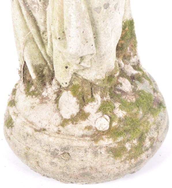 A 20th Century reconstituted stone garden statue / figure in the form of a young maiden stood upon a stepped circular base. Measures approx; 61cm tall.