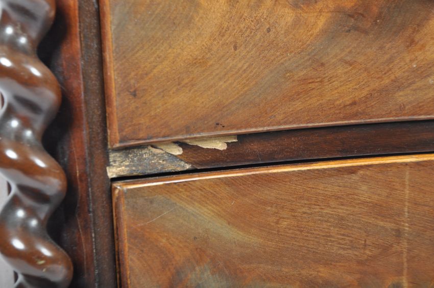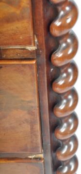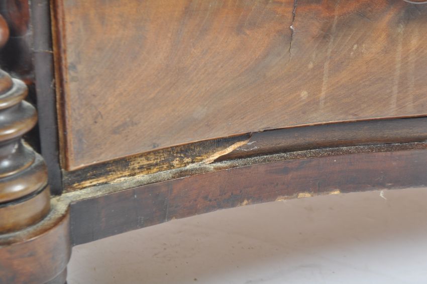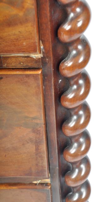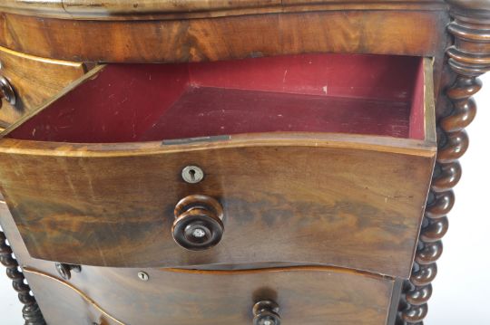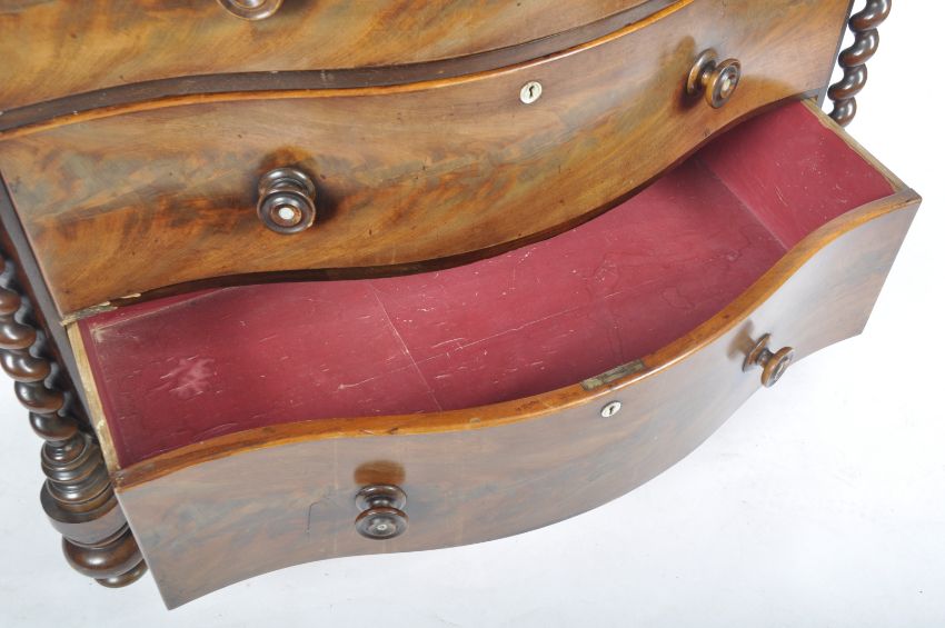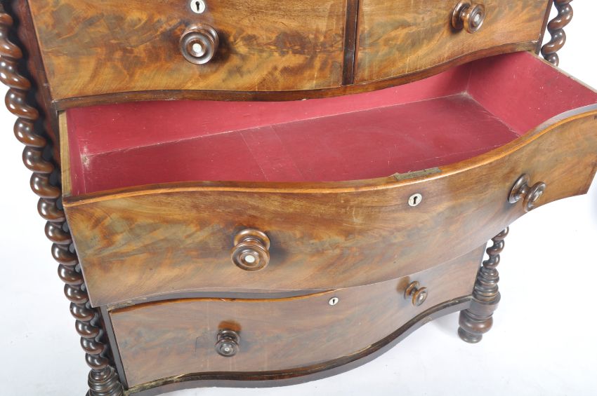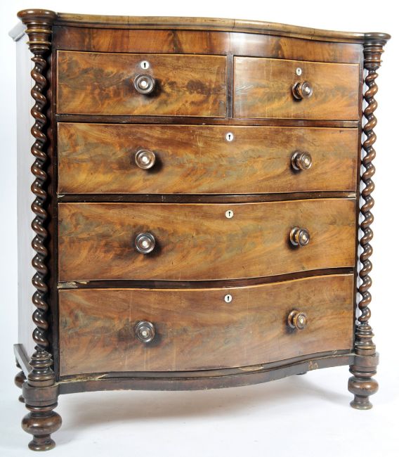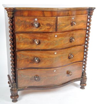 A 19th Century Serpentine mahogany bow front chest of drawers having barley twist columns with knob handles to the 2 short over 3 deep drawers. Measures approx; 125cm x 114cm x 50cm
