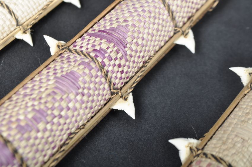 Three 20th Century Oceanic Gilbert Islands Kiribati Shark tooth ' Tebutje ' sword weapons comprising of a two section blades with paired rows of sharks teeth attached with coloured fibre on coconut wood shaft with basket weave handle and detailing. Largest measures approx; 59cm long.