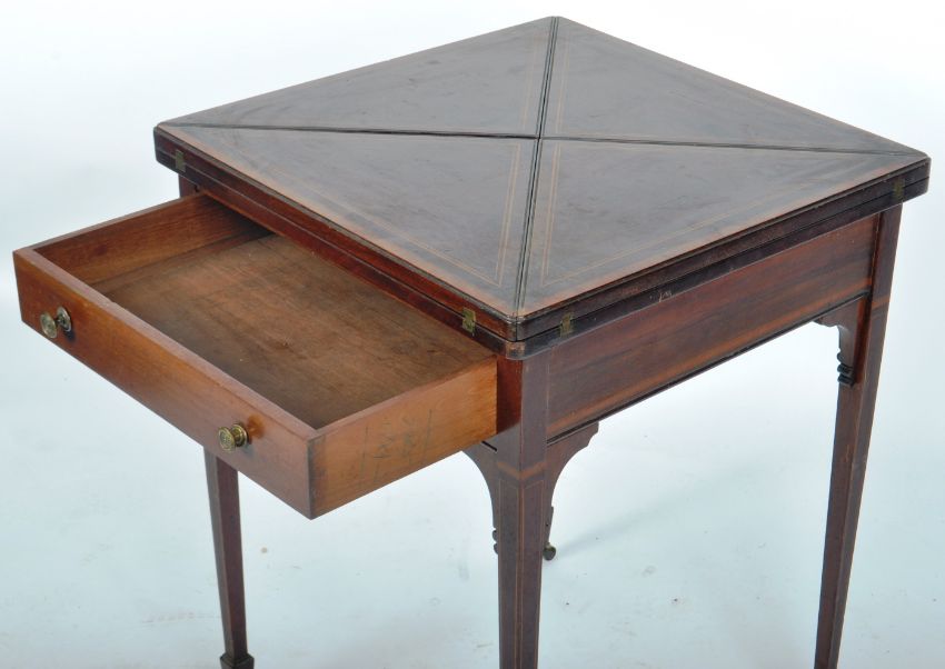 A 19th Century Victorian mahogany envelope card / games table having a four section folding metamorphic top with inlaid borders revealing green baize playing area. Single drawer to the frieze and raised on tapering leg with spadefoot with brass castors. Measures approx when closed; 76cm x 59cm x 55cm.