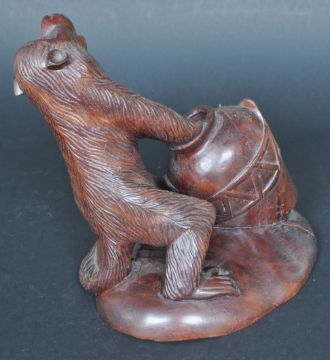 A 19th Century Victorian hand carved Black Forest type figurine depicting a monkey pulling a pot. THe well detailed figure with mouth open set with bone teeth and inset orange glass eyes. Set to a carved base. Some minor splits mostly to base, overall in good order. Measures approx; 13cm tall.