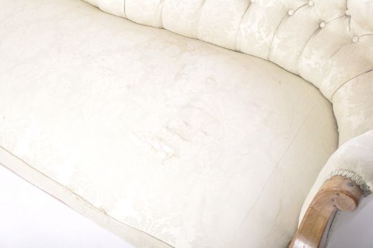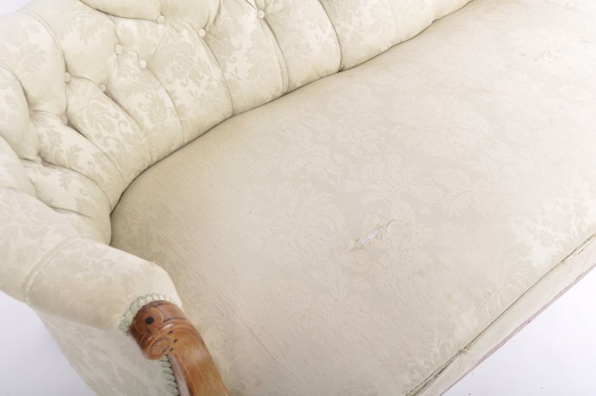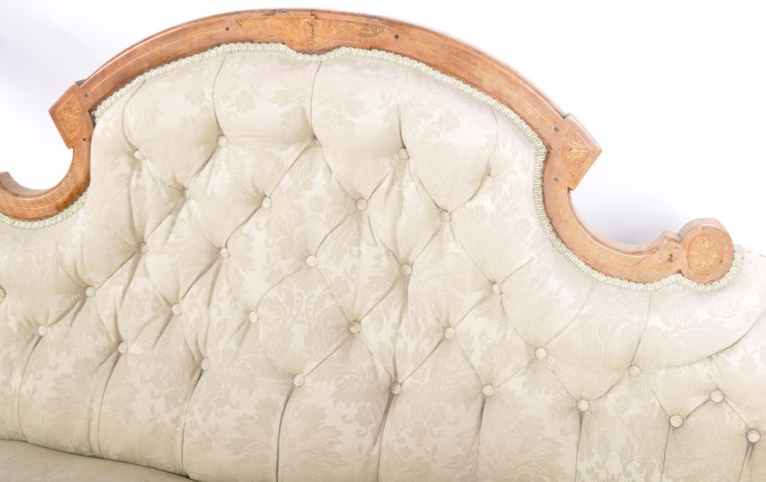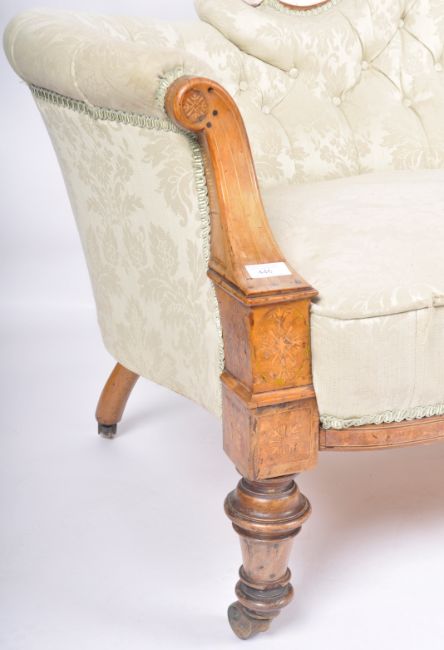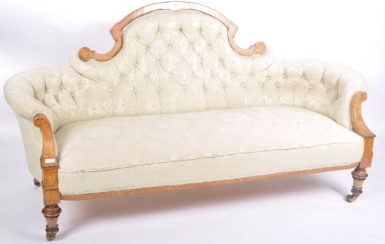 A Victorian 19th century Chesterfield sofa settee being raised on turned legs with castors having a show wood frame with scrolled arms and pediment backrest. Overstuffed upholstery with button back rest. Measures approx; 85cm x 188cm 90cm.