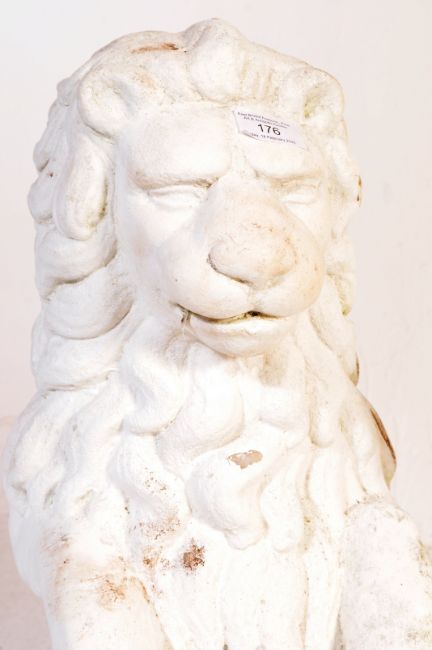 A matching pair of early 20th Century reconstituted stone garden figures in the form of seated lions holding shields. Each finished in white with both raised on stepped square bases. Each lion measures approx; 81cm x 24cm x 25cm.