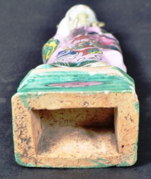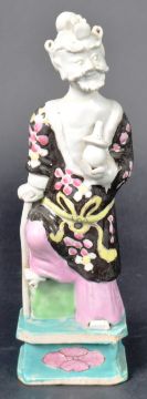 A group of four 18th century Chinese / Oriental Daoist Porcelain figures. Glazed in white & adorned in ornate brightly coloured robes with traditional imagery such as dragon, blossom & butterflies. Each holding a different object & standing on a turquoise / green base with a central pink flower. Condition; some visible damage commensurate with age & glaze defects. Measure approx; 24cm x 7cm.