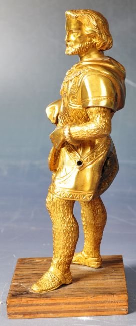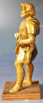 A 20th Century gilt ormolu bronze figure of a nobleman dressed in uniform adorned with a cross around his neck. Detailed decoration throughout with all raised on wooden plinth base. Damage to the verso, overall good. Measures approx; 15cm x 6cm x 6cm.