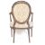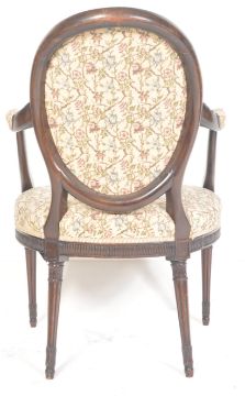 A 20th Century George III manner mahogany armchair / arm chair in the manner of George Hepplewhite having a wheel back circular backrest with floral upholstery seat raised on reeded tapering cylindrical carved legs. Measures; 96cm x 65cm x 51cm.