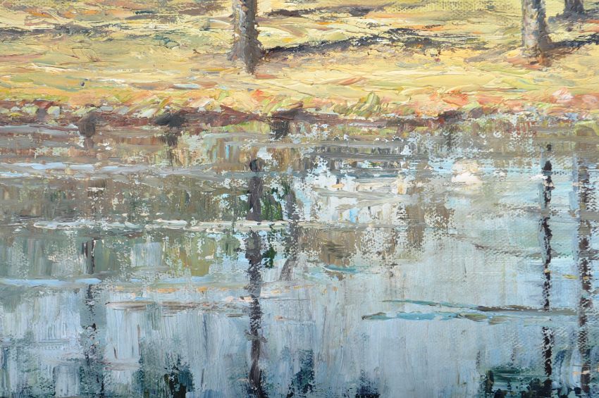 Dorothy Ker Blows - A 20th Century oil and acrylic on canvas painting entitled 'The Pool Harpenden Common'  depicting a woodland scene with a small lake to the foreground with trees beside and a house to the backdrop. Set within a white painted wooden frame with paper label to verso. Measures approx; 50cm x 60cm.