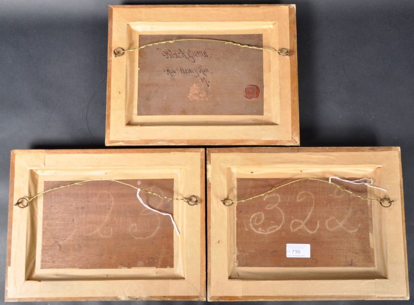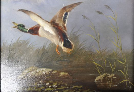 Robert Henry Roe (b, 1793-1880) - A collection of three 19th Century Victorian oil on board paintings with each set within a gilt frame with foliate detailing. One entitled 'Black Game' with two birds to the foreground and mountainous regions to the backdrop (signed and wax sealed to the verso). Together with two studies of Mallard ducks in flight over reeded ponds. Each measures approx; 24cm x 33cm.
