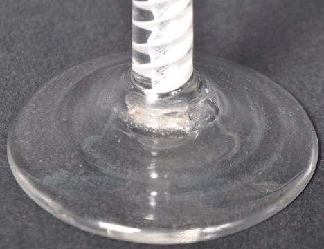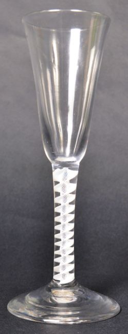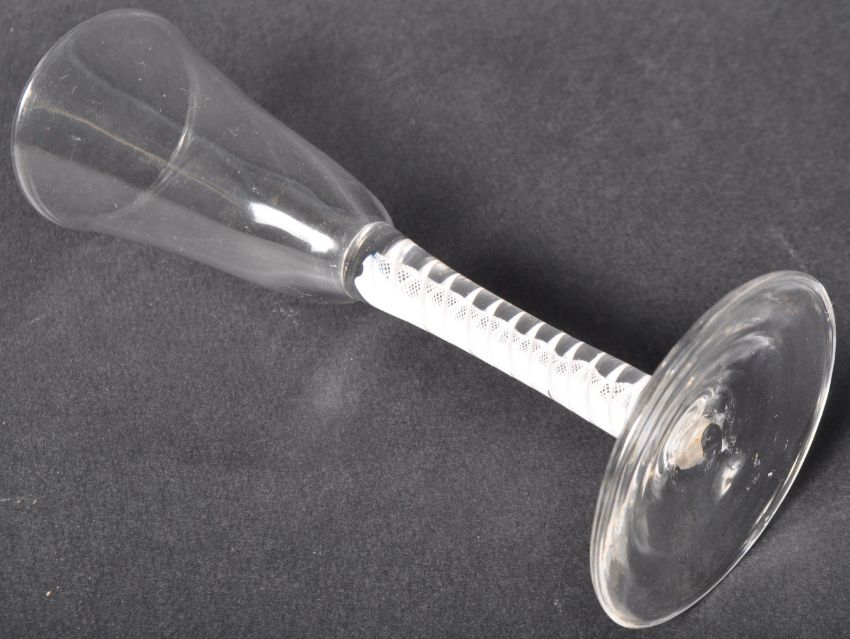 An 18th Century George III glass wine / ale drinking glass having an opaque twist double series stem with waisted bell shaped bowl raised on circular conical foot, No visible signs of major damage. Measures approx; 18cm tall.