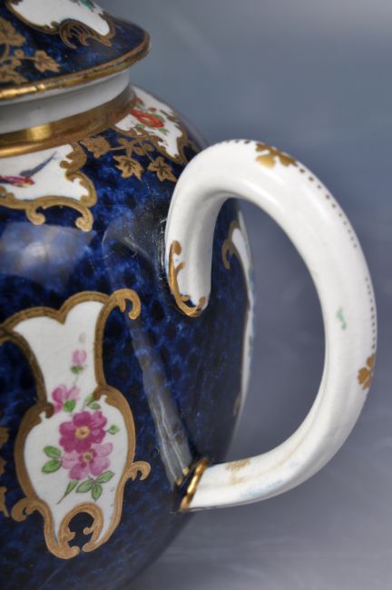 An 18th Century George III believed Worcester hand painted teapot of typical form having a cover atop with painted bird and insect decoration and moulded green painted flower forming the handle. To the body patterned cobalt blue ground with shaped cartouches one decorated with a pheasant and the other floral sprays with gilt borders and highlights throughout. Wear commensurate with age with mostly grazing through. Measures approx; 15cm x 18cm.
