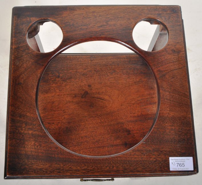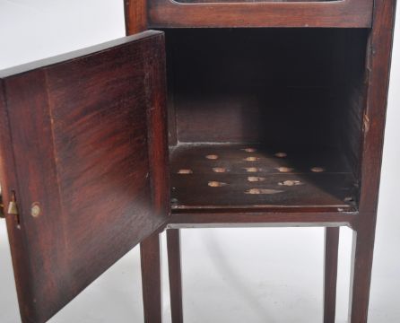 A late 18th century George III mahogany gallery edge night stand. Raised on tall square tapering legs with single cupboard under gallery tray edge top with pierced handles either side. The door with brass pull. Together with a 19th century mahogany washstand of square upright pedestal form having single drawer and pierced top above. Jug tier to base. Along with another. Measures approx; 80cm x 30cm x 30cm.