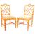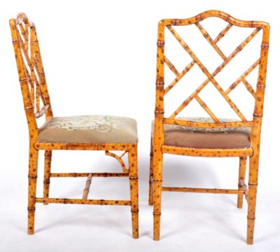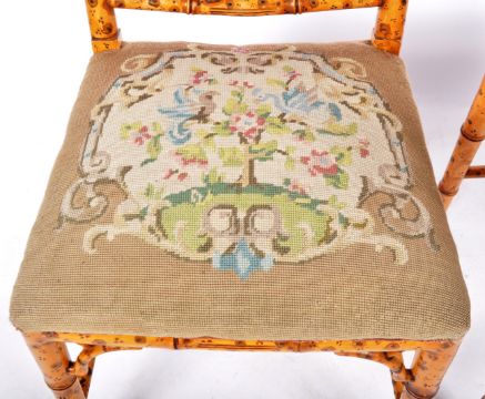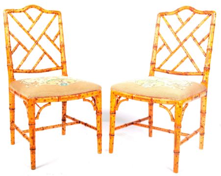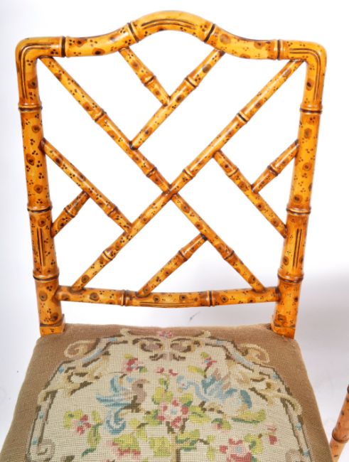 A pair of 18th Century style faux bamboo chairs having painted back simulating bamboo with decorative worked backrest and tapestry upholstered seat rests with floral decoration. Raised on tapering supports united by a single stretcher. Each chair measures approx; 89cm x 48cm x 46cm.