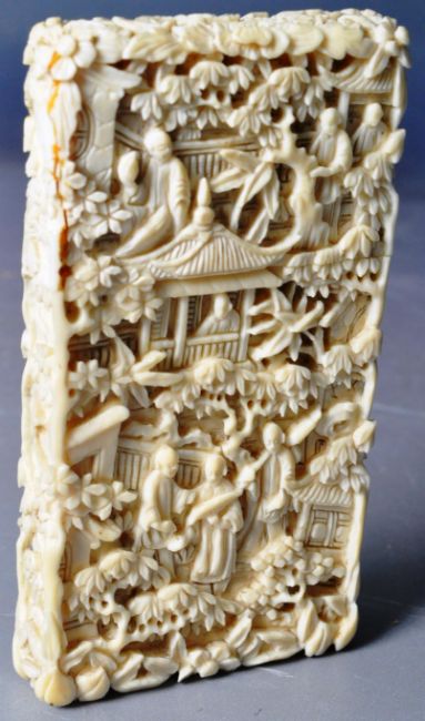 A 19th Century Chinese Cantonese Canton region ivory calling card case having profuse decoration depicting scenes of figures, trees and buildings within a busy landscape. Matching decoration to all sides and lid. Repair to lid. Measures approx; 9cm x 4.5cm.