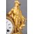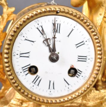 A 19th Century French ormolu mantel clock of decorative form having a white enamel clock face with Roman numeral chapter ring and pierced hands. Classical gentleman figure to the surround with scroll and foliate decoration throughout. Raised and displayed with a glass domed case having an oval ebonaihed base. Measures approx; 45cm x 32cm.