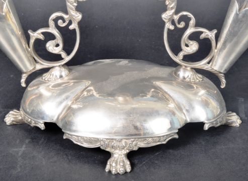 An early 20th Century Walker & Hall silver plated triple centerpiece epergne comprising of a central large fluted glass vase flanked by two smaller raised on a silver plated scrollwork stand with claw feet. No visible signs of major damage to the glass. Measures approx; 36cm x 41cm.