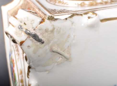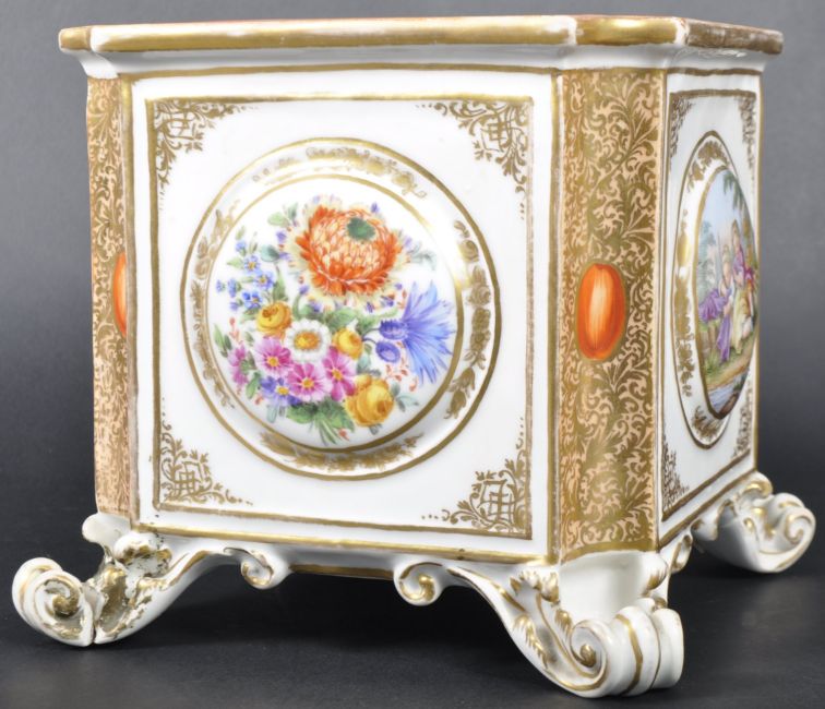A 19th Century German Meissen porcelain planter of square form in the manner of Helena Wolfsohn. The jardiniere similar to Dresden examples and hand painted with panels depicting classical scenes & botanical sprays and having gilt detailing throughout. AF. Blue AR mark to base. Measures approx; 18cm x 19cm.