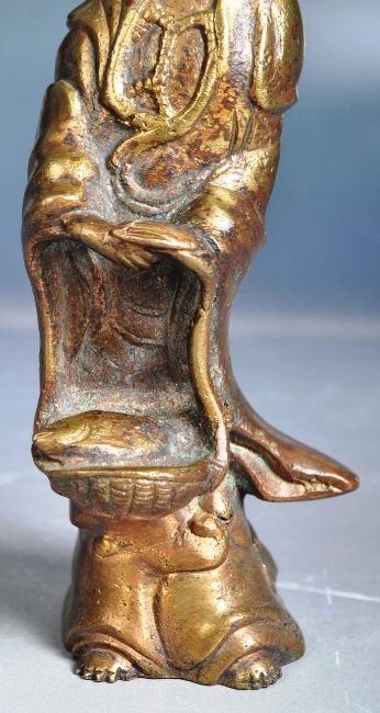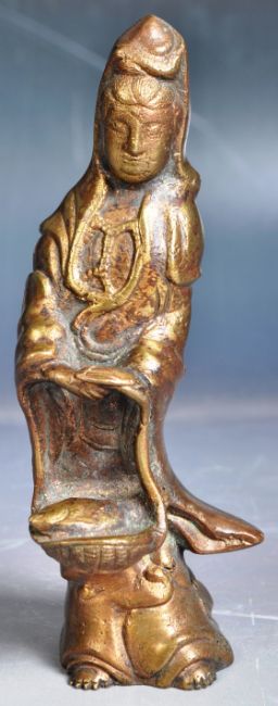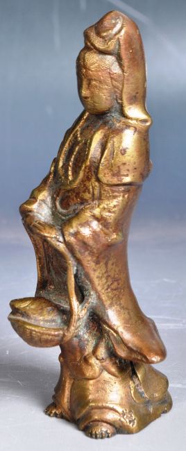 A 19th Century Chinese bronze figurine of Guanyin Goddess of Mercy. The figure depicting in typical attire holding a basket with robed draped to feet. Measures approx; 13cm tall.