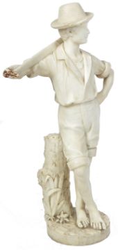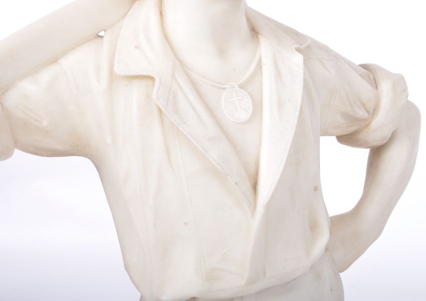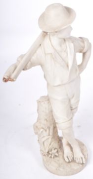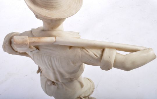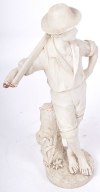 A large 19th Century Italian white marble statue figurine depicting a huntsman. The man modelled standing with axe resting behind neck wearing hat, shirt and shorts stood barefoot on naturalistic circular plinth base. AF. Measures approx; 86cm x 49cm.