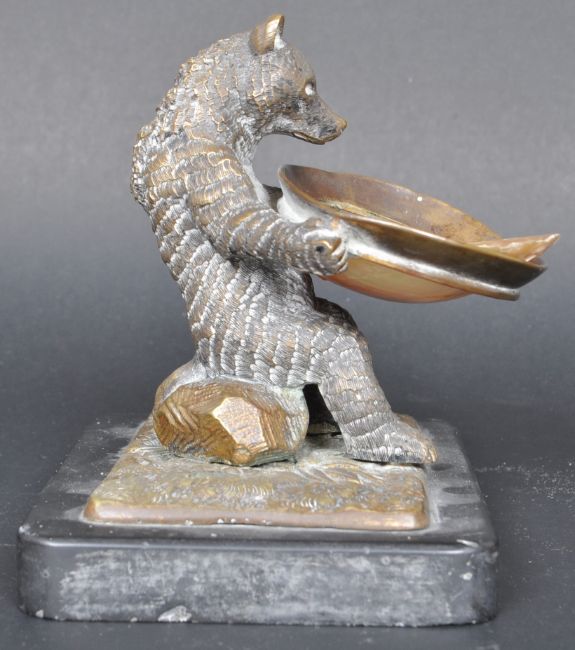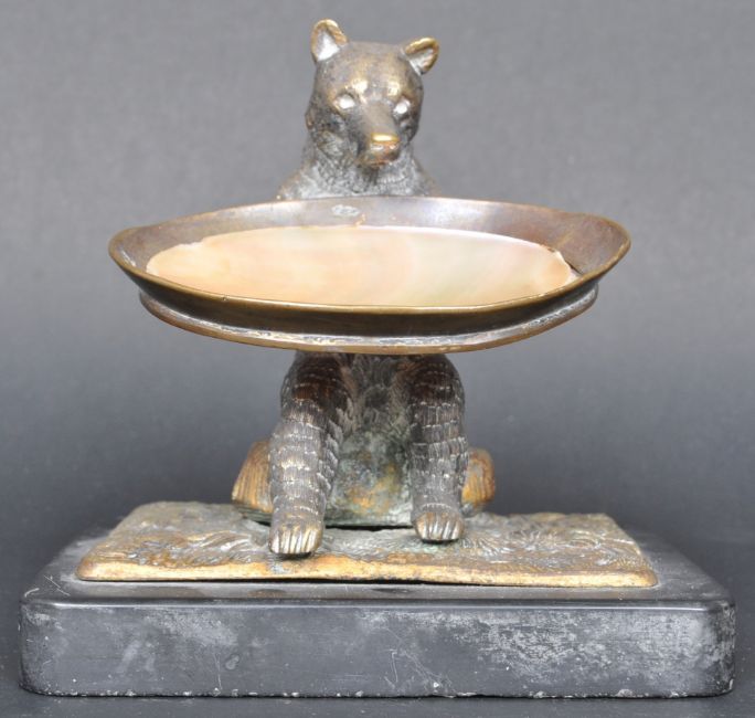 An early 20th Century bronze table salt in the form of a Black Forest manner bear. The bear seated on a log in an upright position with dish in hand with inset (loose) mother of pearl shell panel. Set to an naturalistic base on black marble / slate plinth. Measures approx; 12cm tall.