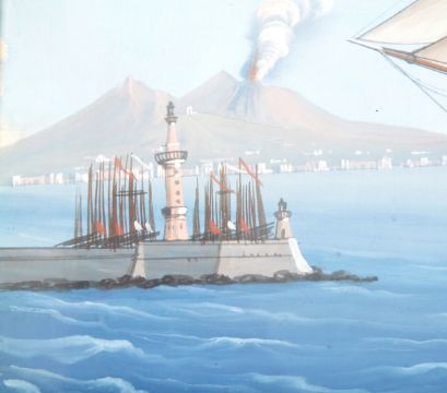 A mid 19th Century Italian Neapolitan gouache oil painting depicting a sailing ship in the Bay of Naples. The painting depicts the ship / boat the Georginia with smoke emitting from Mt Vesuvius on clam scene with small buildings. Dated 1845. Framed & glazed. Measures approx; 61cm x 79cm.