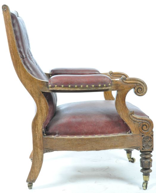 A 19th Century William IV carved oak library armchair club chair having a brown leather button backed backrest with carved scrolling sides terminiting to the padded leather armrests with scroll ends. Overstuffed leather seat pad with brass stud detailing throughout with all raised on turned leg supports with further carved decoration and brass castors. Measures approx; 105cm x 73cm x 77cm.
