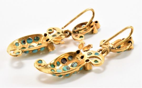 A pair of 19th Century Victorian gold and turquoise drop earrings. The antique earrings of scrolled design set throughout with round turquoise cabochons, with fish hook backs. Unmarked tests indicate 18ct gold. Weight 9.8g. Measures 4.3cm. Weight 9.8g.