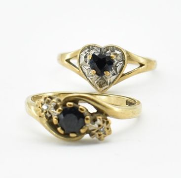 Two hallmarked 9ct gold sapphire and diamond rings.  A sapphire and diamond heart ring. Weight 1.5g. Size M. A  sapphire and diamond crossover ring. weight 2.3g. Size M.