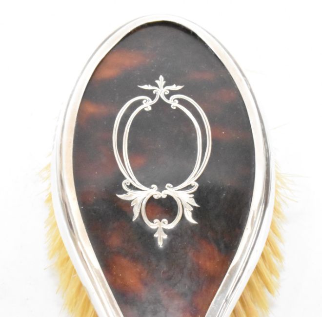 An early 20th Century silver and tortoise shell dressing table set. The set to include two hair brushes, two clothes brushes and a hand held mirror. Hallmarked Birmingham 1925, Hasset & Harper Ltd. Hair brush measures 23cm, clothes brush measures 15cm. All set within leatherette box.