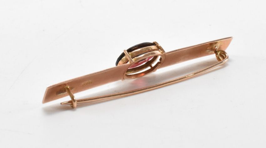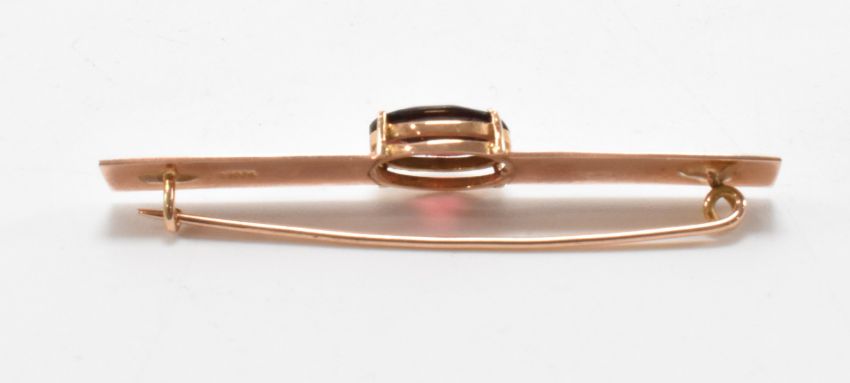 A vintage gold and garnet bar brooch. The brooch being set with an oval cut garnet to the centre prong set within a flat bar mount. Hinge pin and c clasp to verso. Measures 5cm wide. Garnet measures 8.5 x 10.5mm. Weight 3.1g. Marked 18k, tests indicate 18ct gold.