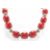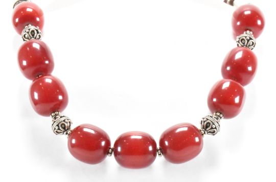 A silver white metal and red bead necklace. The necklace having round red stone beads spaced with white metal spacers, with large cylindrical beads to the centre. Unmarked. Measures