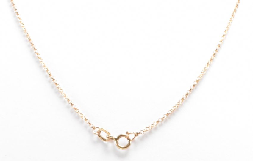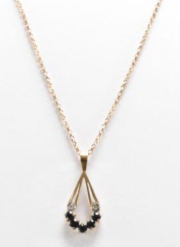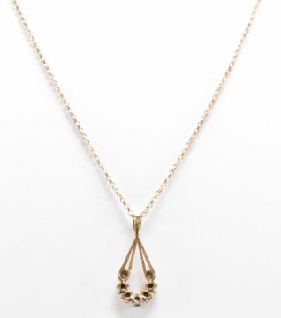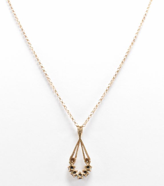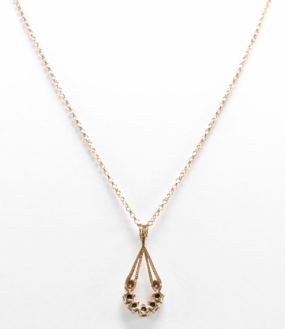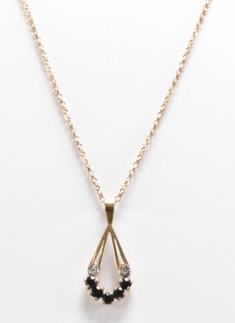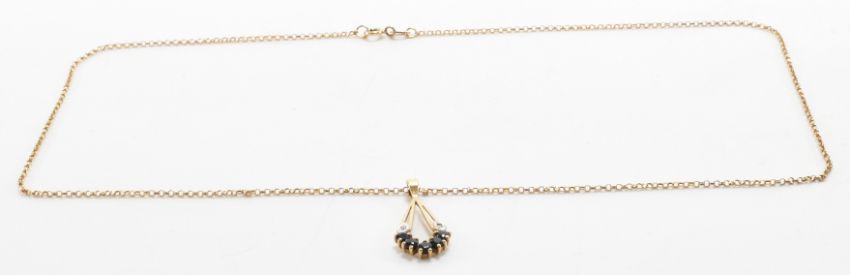 A hallmarked 9ct gold, diamond and sapphire pendant necklace. The necklace having a fine link chain with a drop shaped pendant set with five round cut sapphires and two diamond accents. Chain import marked Birmingham 1991, pendant assay marked Birmingham. Chain measures 18 inches, pendant measures 2.5cm. Total weight 2.4g.