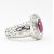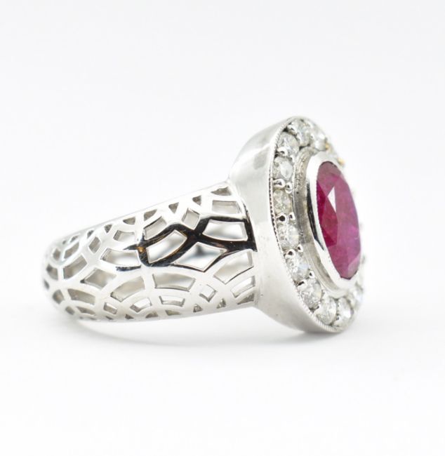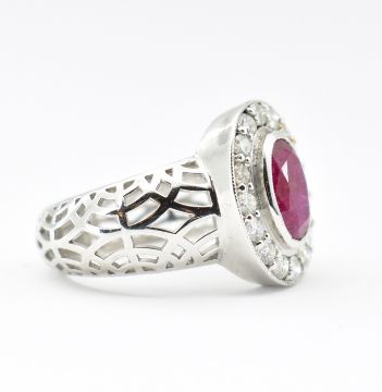 A ruby and diamond cluster ring. The ring set with an oval mixed cut ruby framed by 16 diamonds to domed pierced shank. Unmarked tests indicate 18ct gold. Estimated diamond weight 0.48ct. Ruby measures approx 8.9mm x 6.5mm x 3mm. Weight 5.8g. Size O.5.