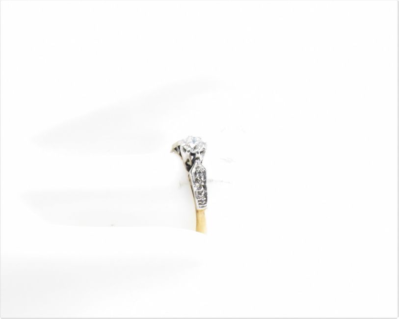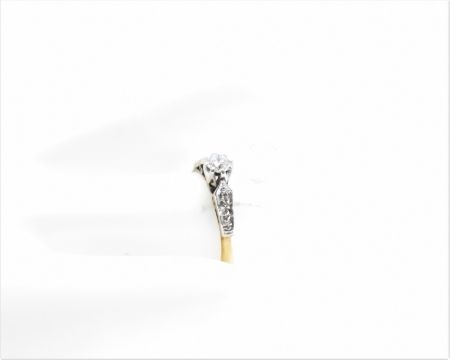 A vintage gold and diamond ring. The ring having a gold band with white metal shoulders, The ring being set with a round cut diamond, with further diamond chips to the shoulders. Marked 18ct & plat. Weight 2.0g. Size K.5. Diamond measures approx 4mm diameter x 2.5mm.
