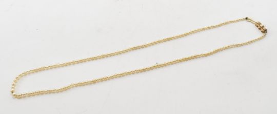 A hallmarked 9ct gold and pearl necklace. The necklace threaded with pearls on a knotted string, having a bow shaped clasp. The clasp hallmarked Birmingham 1972. Weight 4.1g. Necklace measures 17.5 inches.