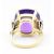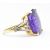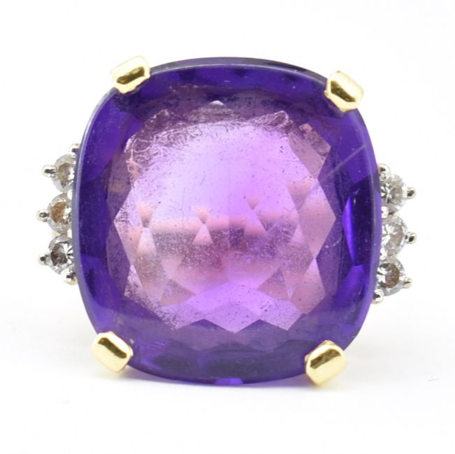 A hallmarked 18ct gold amethyst and diamond cocktail ring. The ring set with a large mixed cut amethyst cabochon flanked by rows of 6 round brilliant cut diamonds.Hallmarked Sheffield. Sponsor S.A. Weight 10.4g. . Size M.5.