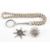 A silver hallmarked magnifying glass pendant on a white metal guard chain with rounded reeded links. Together with a silver hallmarked sun brooch (hallmarked London 1990, ASB) and a silver hallmarked white stone and pearl brooch (hallmarked Birmingham 1965, BSW). Marked silver weight approx 50g. Chain measures approx 46cm, brooches measures 5cm and 3.5cm.
