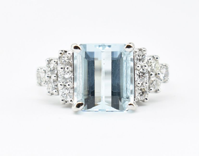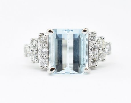 An Art Deco style aquamarine and diamond ring. The ring set with an octagon step cut aquamarine flanked by diamond set terraced steps to plain shank, in white gold.  12 round brilliant cut diamonds estimated total diamond weight  0.60ct. Aquamarine  measures 9.7 x 8.3 x 6.2mm. Unmarked tests indicate 18ct gold.  Weight 5.1g. Size P