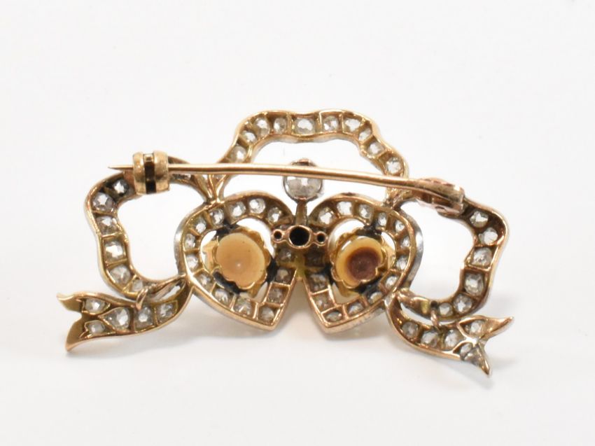 An early 20th Century Edwardian diamond and half pearl twin heart brooch. The brooch set with two round half pearls within two hearts with ribbon detailing, set throughout with old cut diamonds. Hinge pin and rollover clasp to verso. Set within a Edward P Mallory of Bath box. Central diamond measure 3.4mm diameter. Pearls measure 5.7mm and 5.3mm diameter. Measures 4cm wide.