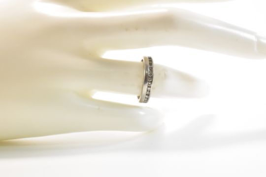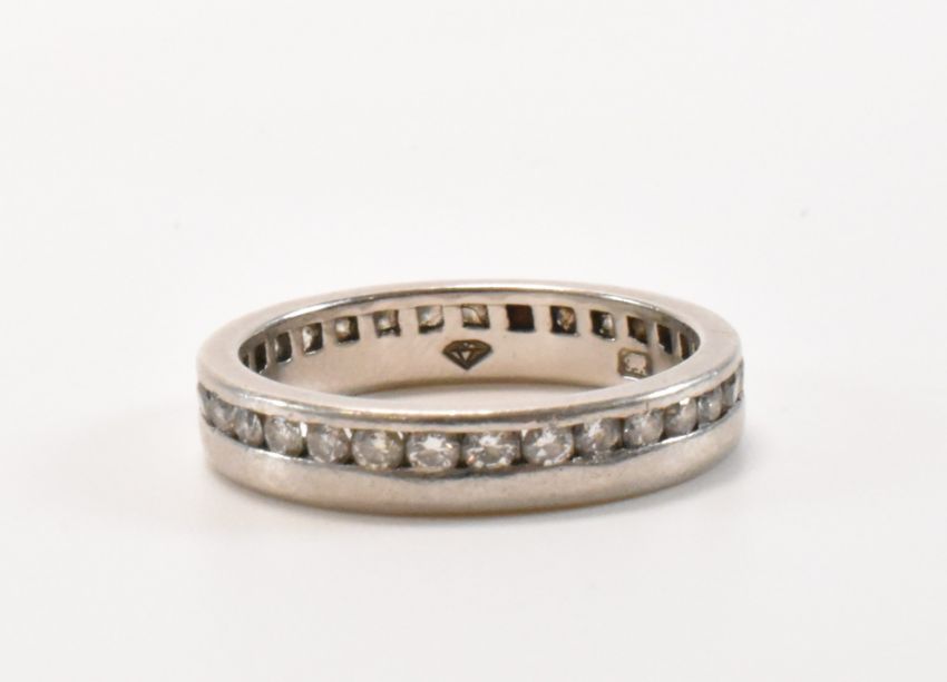A platinum and diamond eternity ring being channel set with round cut diamonds throughout. Marked plat to the band, tests indicate platinum. Weight 5.2g. Size L.5.
