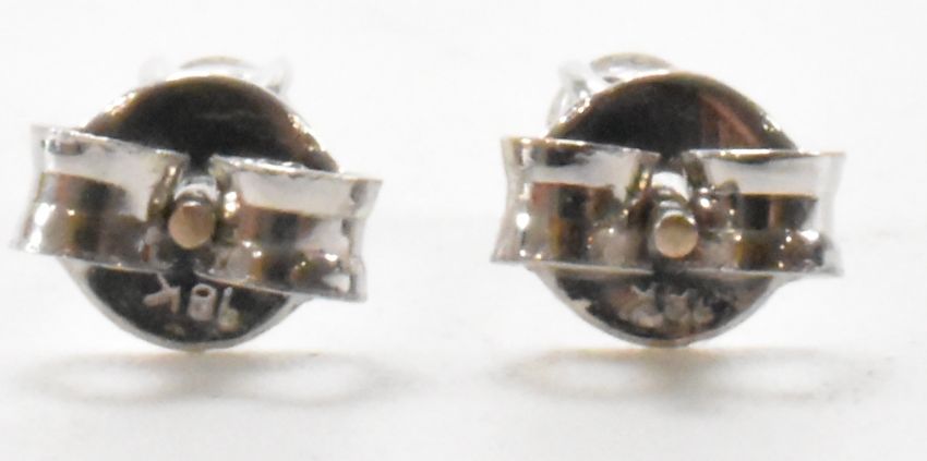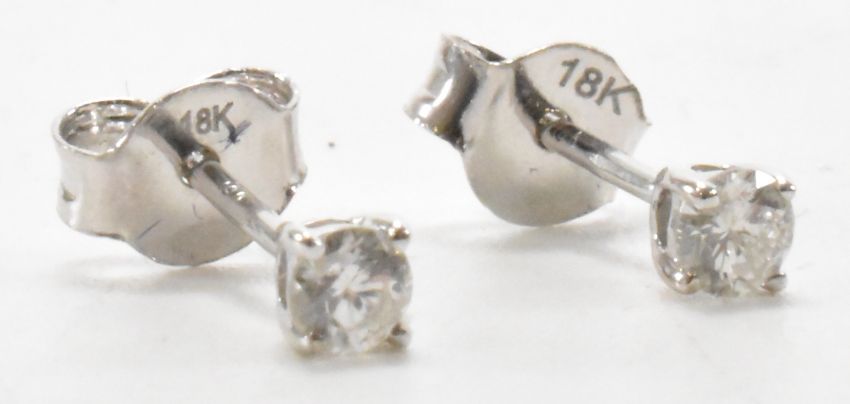 A pair of hallmarked 18ct gold and diamond stud earrings. The earrings being set with round cut diamonds in prong settings. Diamonds measure 3.1mm diameter. Posts assay marked Sheffield, backs marked 18k. Weight 0.8g.