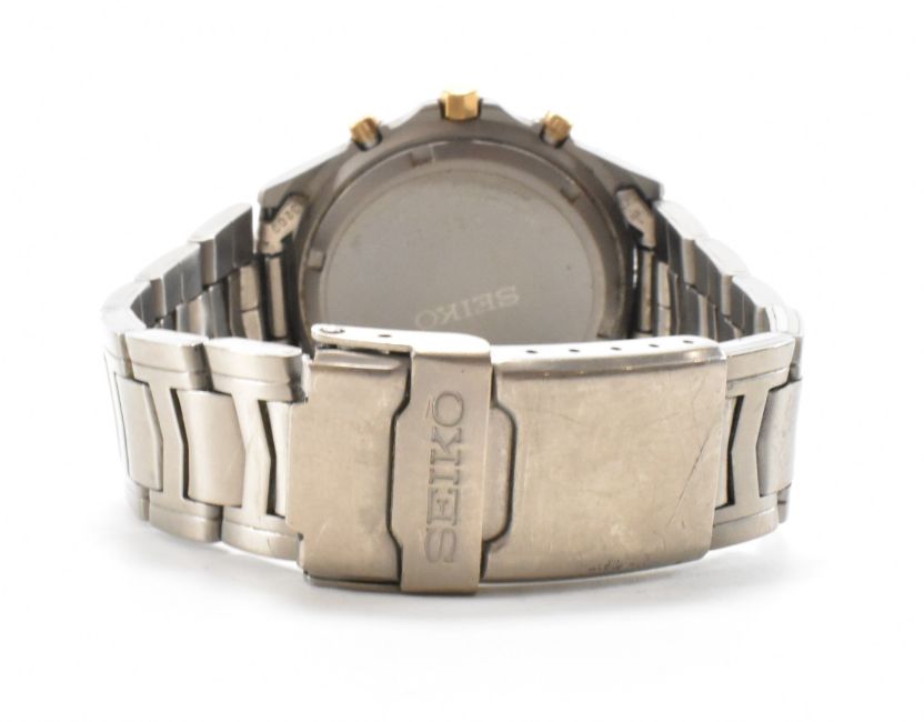 A Seiko chronograph Titanium 100m wrist watch. The watch having a black face gilt baton numerals to the chapter ring, tachymeter dial, date aperture to three and three subsidiary dial. Set to a titanium bracelet strap. Face measures 40mm.