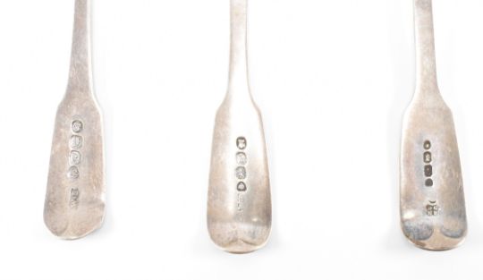 A harlequin set of six 19th Century silver hallmarked fiddle pattern teaspoons all engraved with the initial 'C'. The lot to include three Victorian 1854 London hallmarked Samuel Hayne & Dudley Cater spoons, a William IV 1831 London hallmarked Jonathan Hayne spoon, a George III 1791 London hallmarked spoon (sponsors mark rubbed) and a William Bateman I London 1821 hallmarked spoon. Total weight 132.2g. Spoons measure 14 - 14.5cm.
